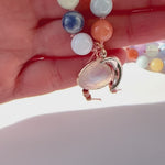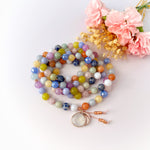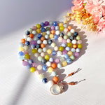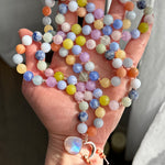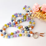 This Harmony Mala Necklace is hand knotted with Morganite Kunzite Amethyst Amazonite Aquamarine Cherry Blossom Blue Lace Agate Fire Agate Lemon Jade Spotted Jasper Yellow Jade and Orange Calcite Mala Beads.