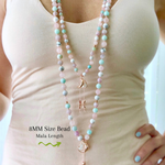 - The necklace is about 18 inches (6mm beads) or 22 inches (8mm beads) long down the neckline when measured from the back of the neck down to the middle of the torso.
