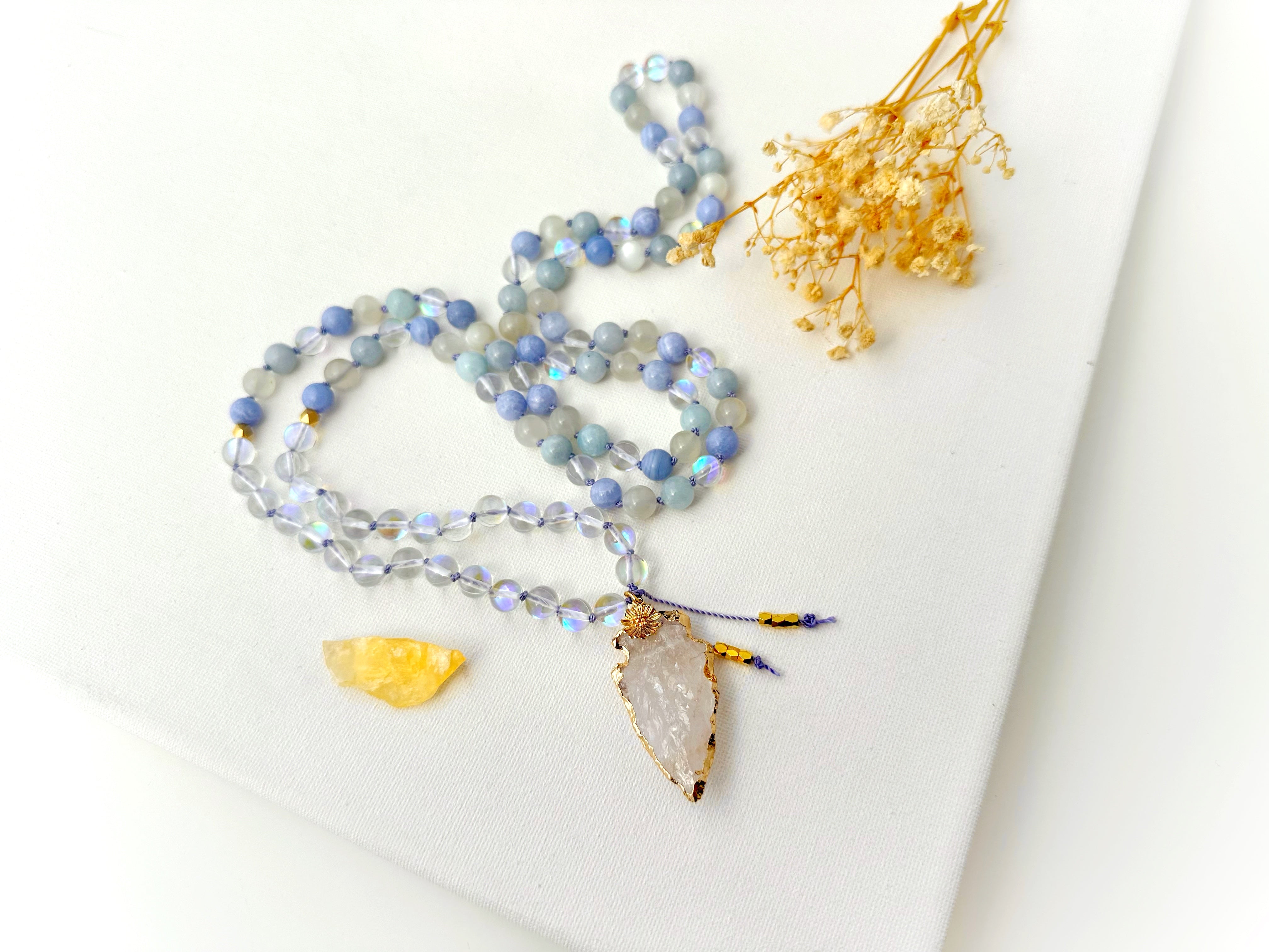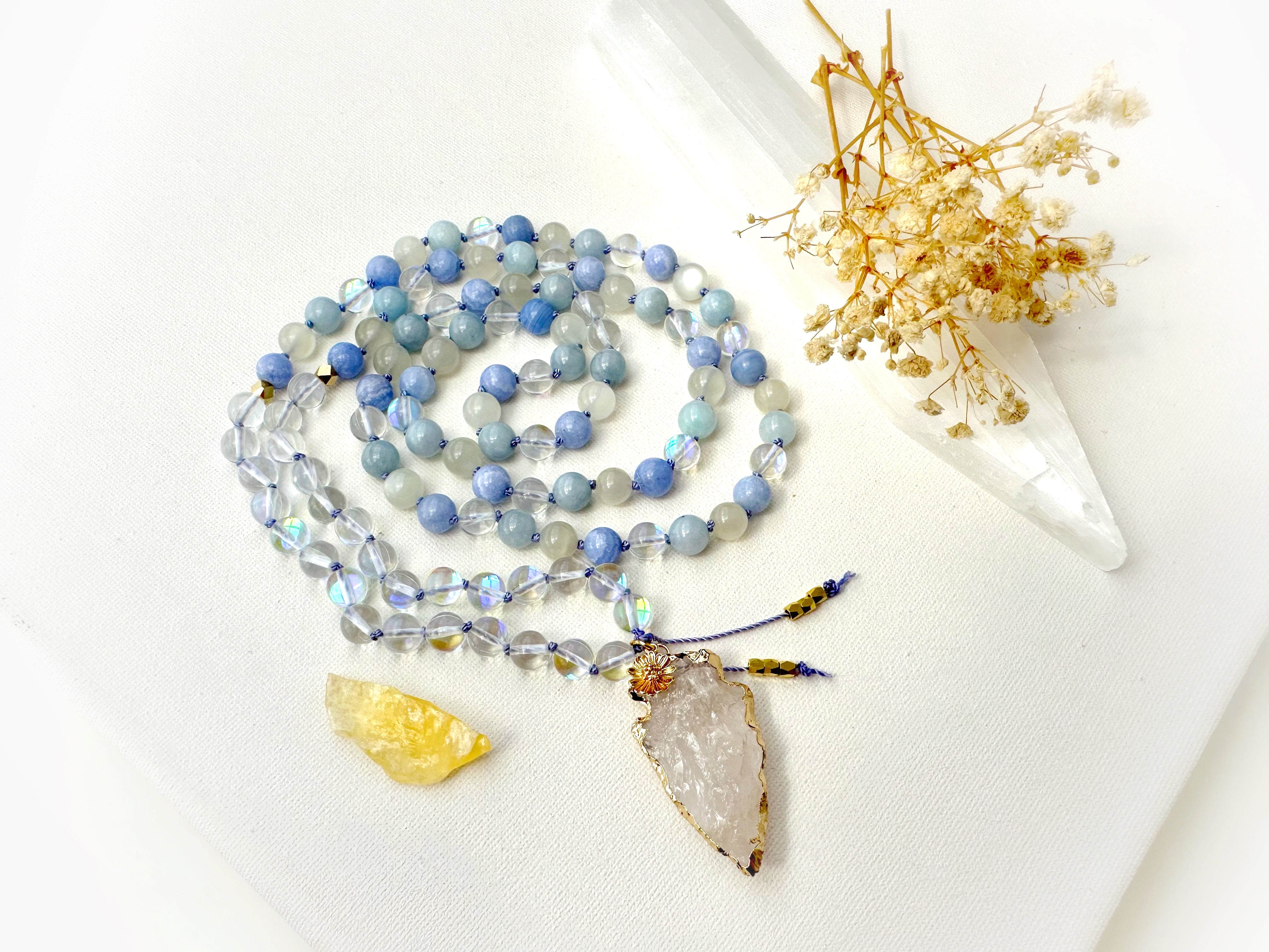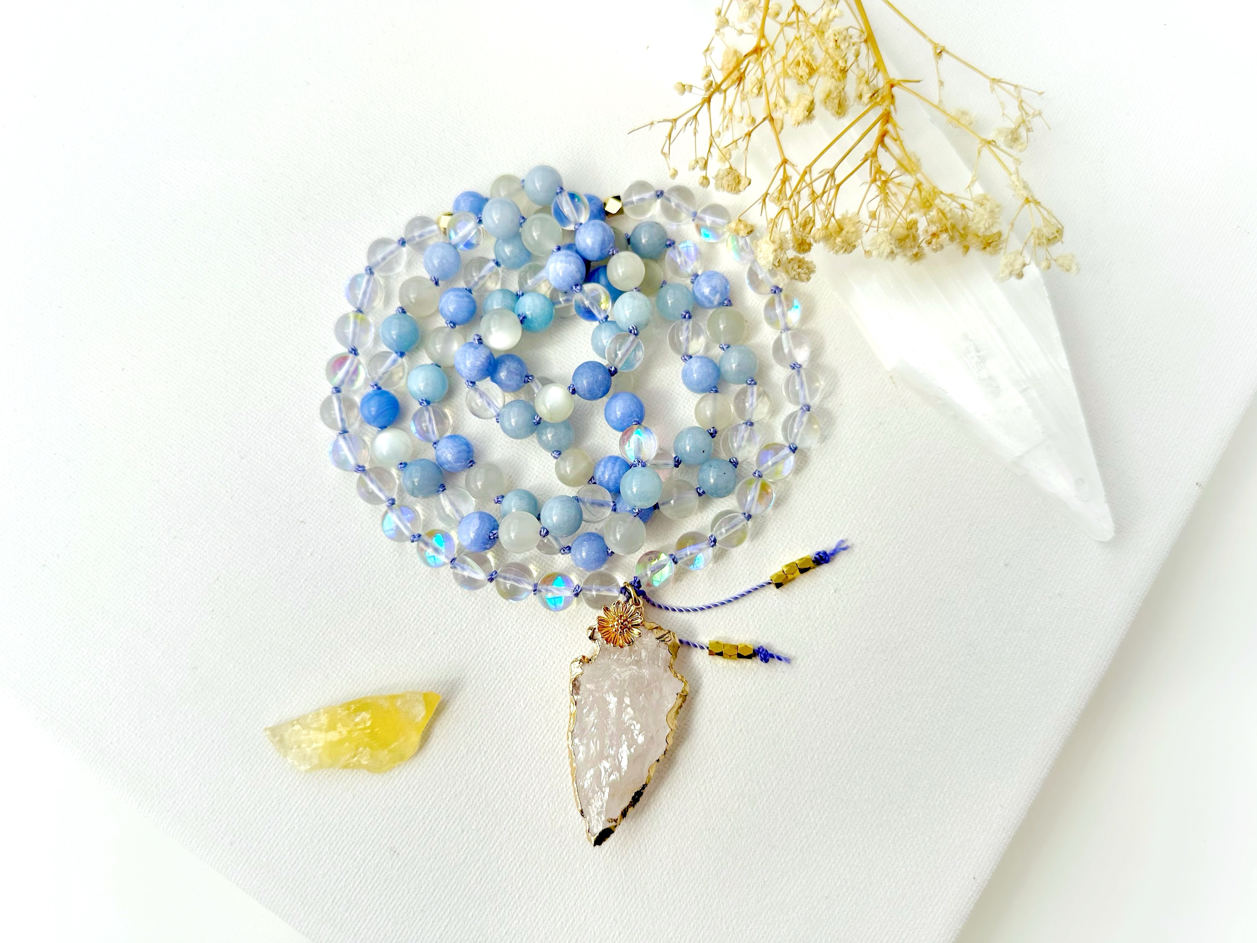 This Ocean Serenity Mala Necklace is hand knotted with Moonstone, Aquamarine, Blue Lace Agate and Mystic Aura Quartz Mala Beads.
