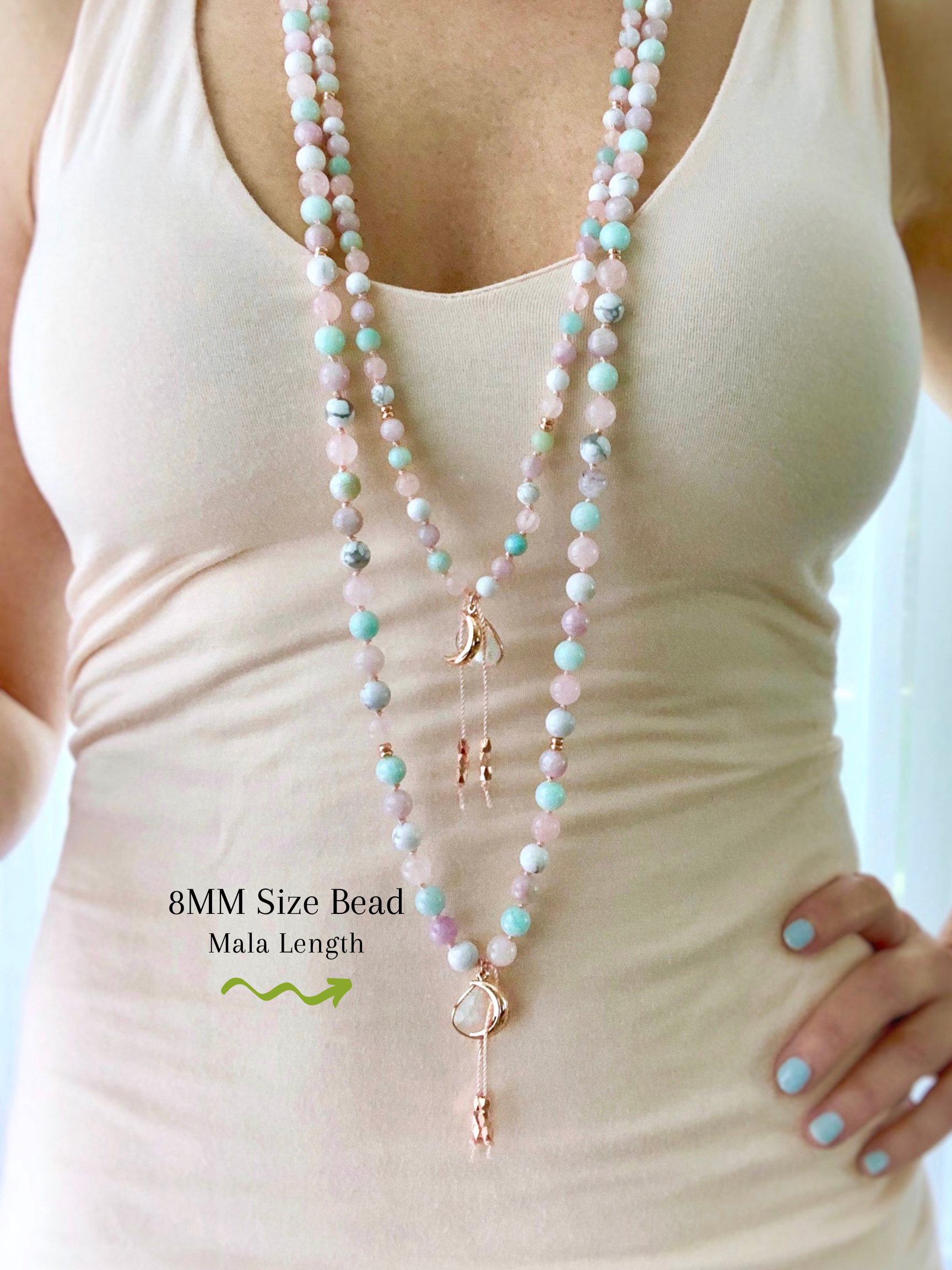 I only use natural gemstones and crystals to handcraft each and every one of my Malas. There might be small differences in colors, shapes and sizes. I carefully choose the stones that go in to each and every piece and I can assure the aesthetics of your piece will be just as beautiful as you see in the picture above. All pieces are made with love in my smoke-free and pet-free studio.