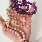 Each piece is hand knotted one at a time in my New Jersey studio using natural gemstones chosen for their color, texture, and overall flow. Subtle variations are part of the design, making every mala one of a kind rather than mass produced.