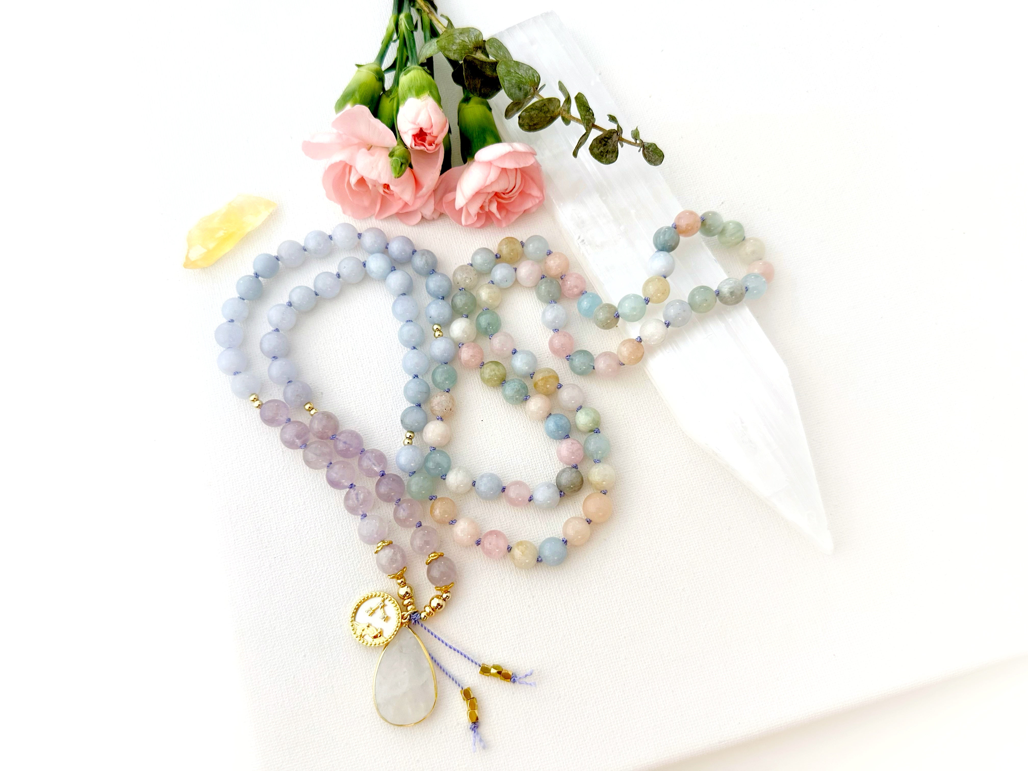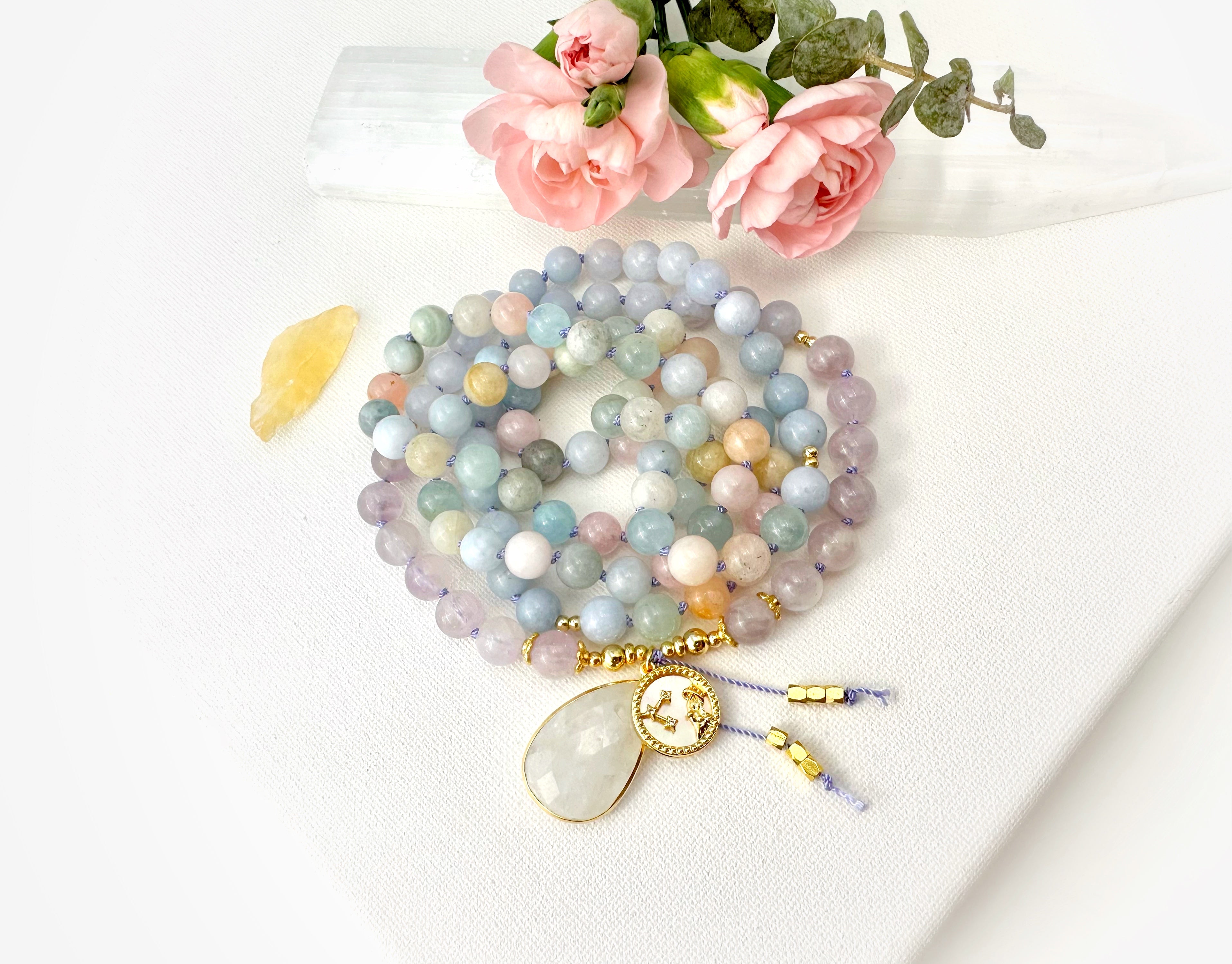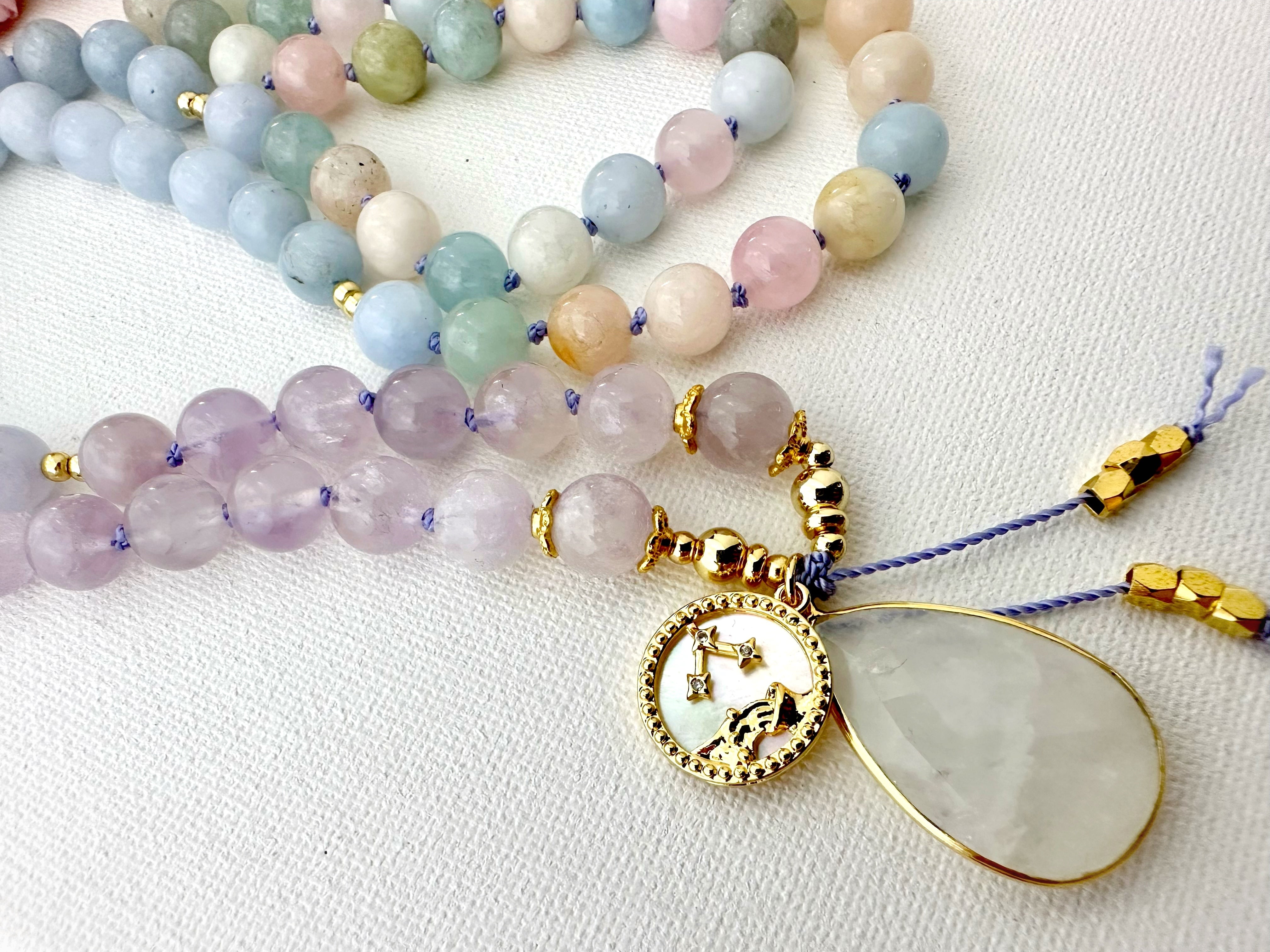 The Visionary Sky Aquarius Mala Necklace is hand-knotted with Amethyst, Morganite, and Aquamarine beads, designed to enhance Aquarius' innovative thinking, open-mindedness, and deep sense of intuition.