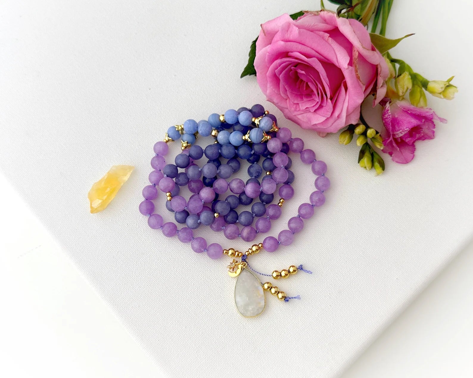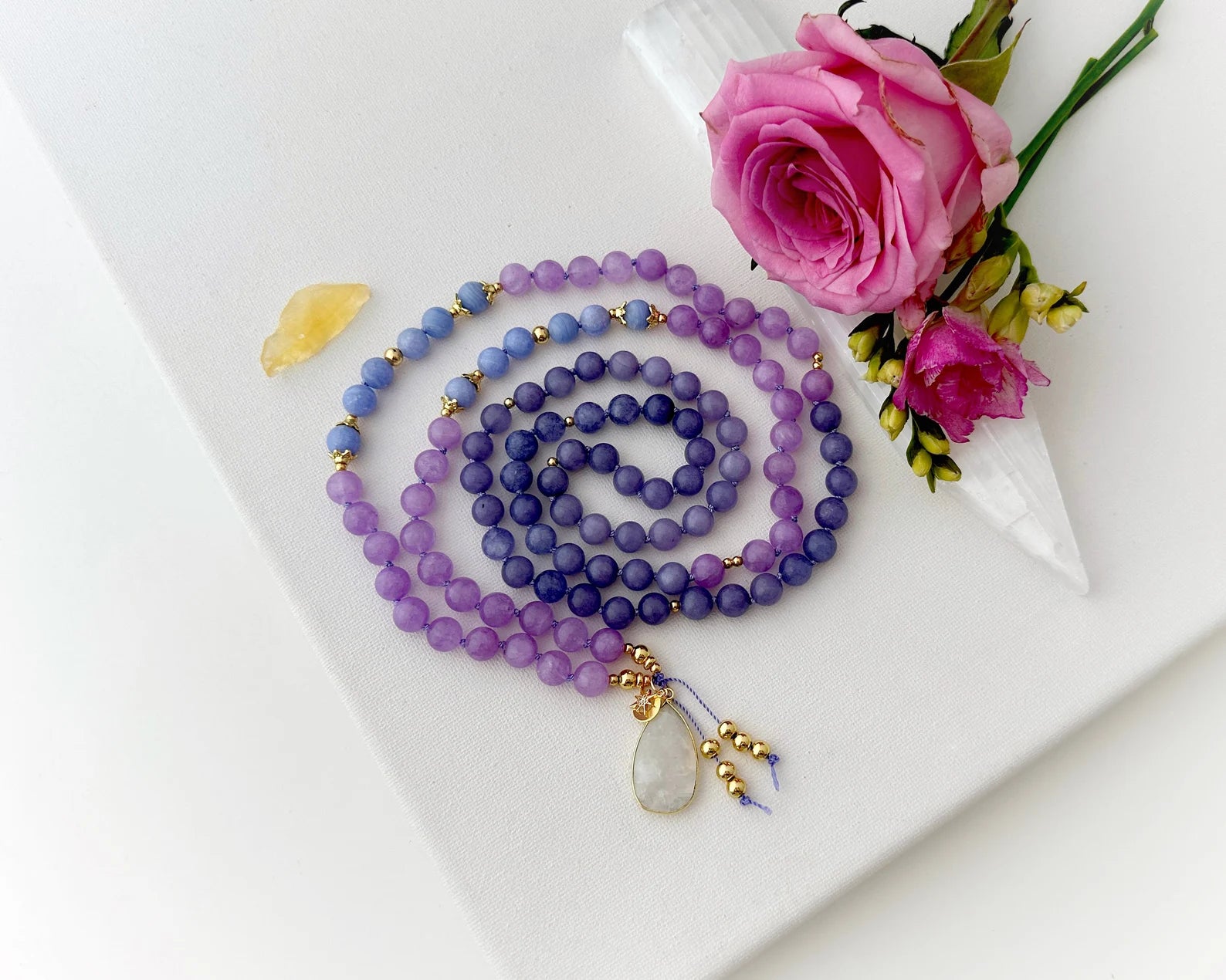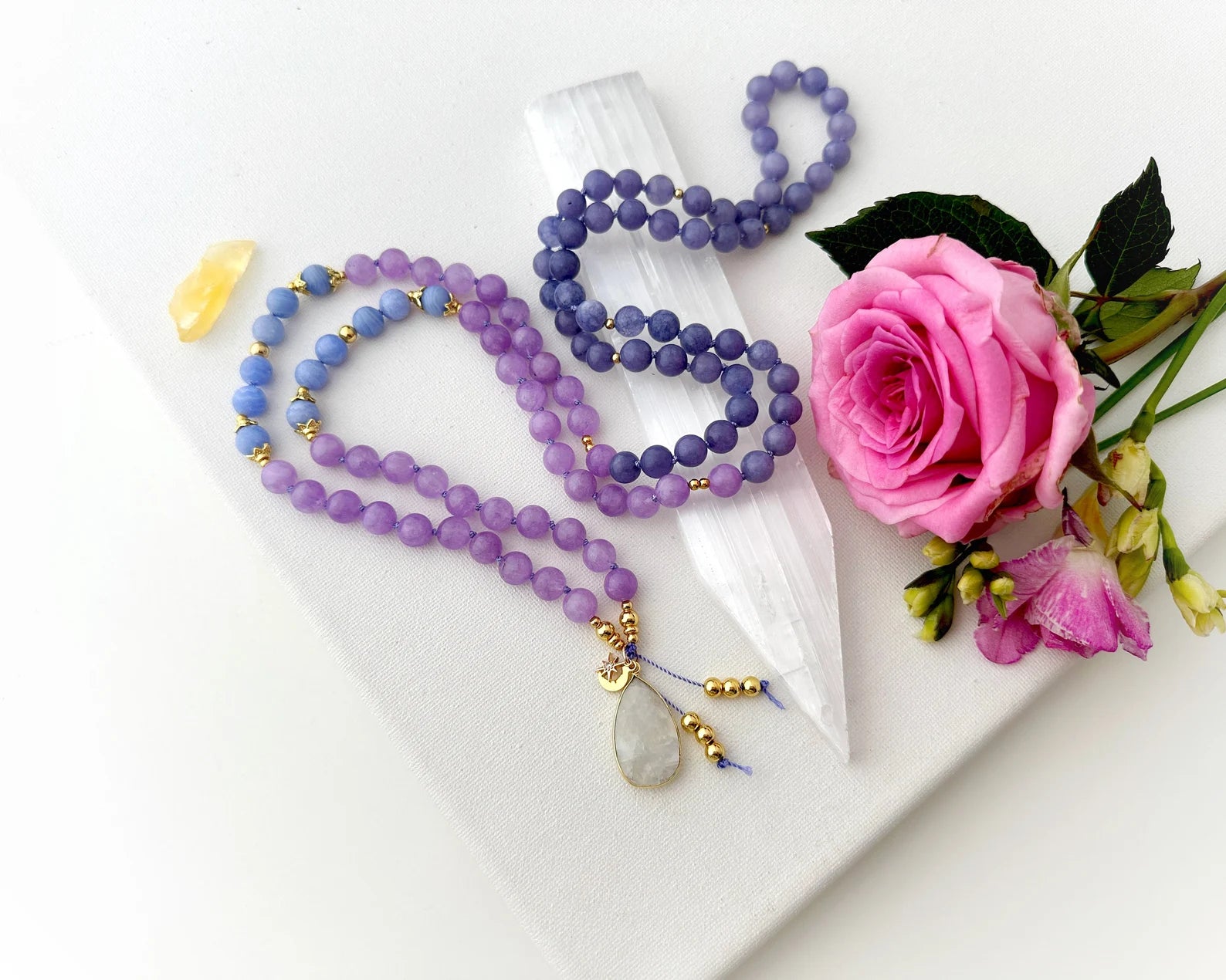 The Goddess Mala Necklace is hand-knotted with Tanzanite Blue Lace Agate and Amethyst beads.