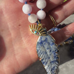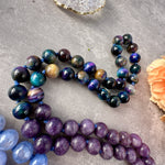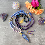 This Royal Blossom Mala Necklace is hand knotted with Kunzite, Fire Agate, Blue Lace, Aura Tiger and Lepidolite Mala Beads.