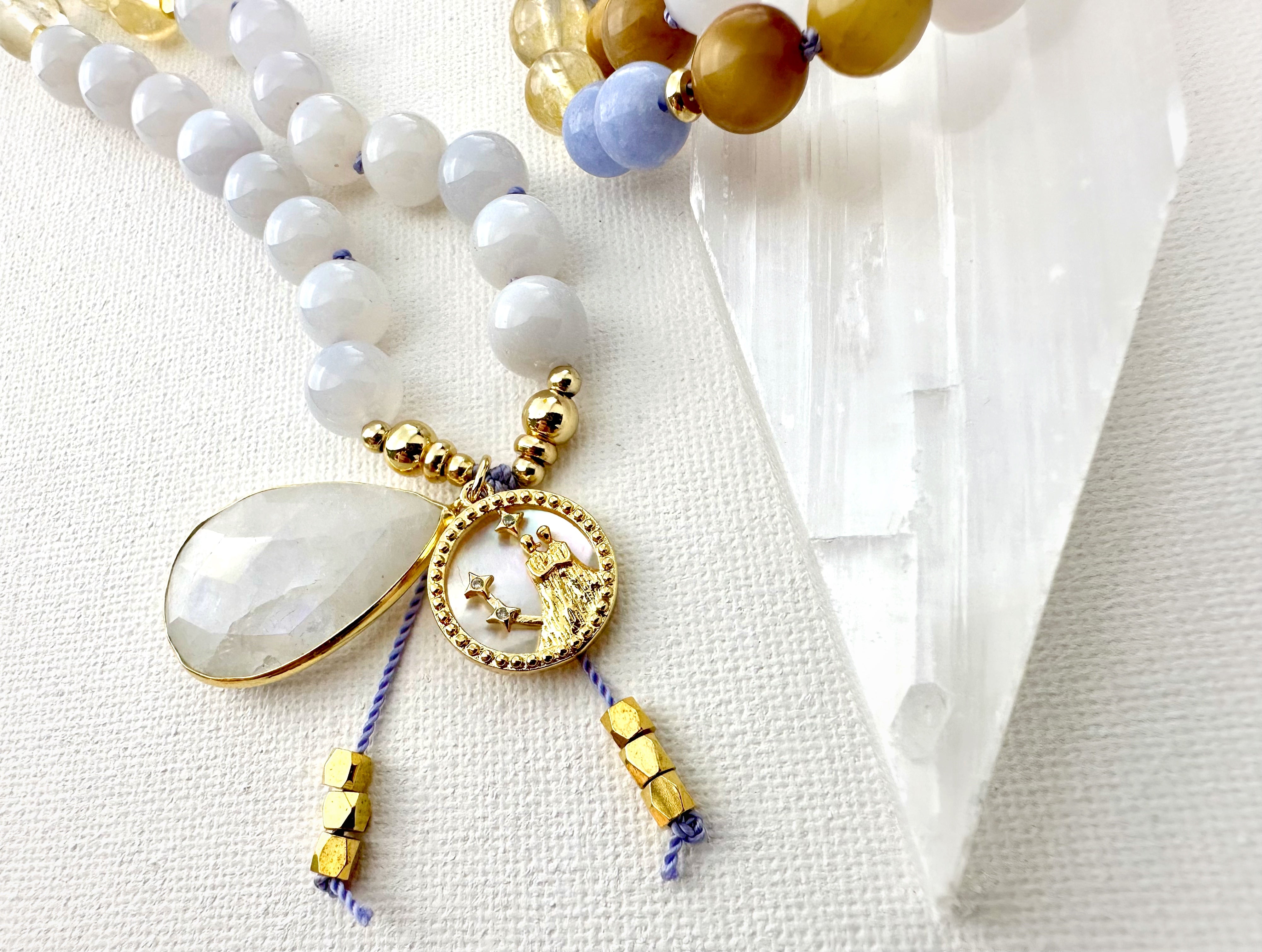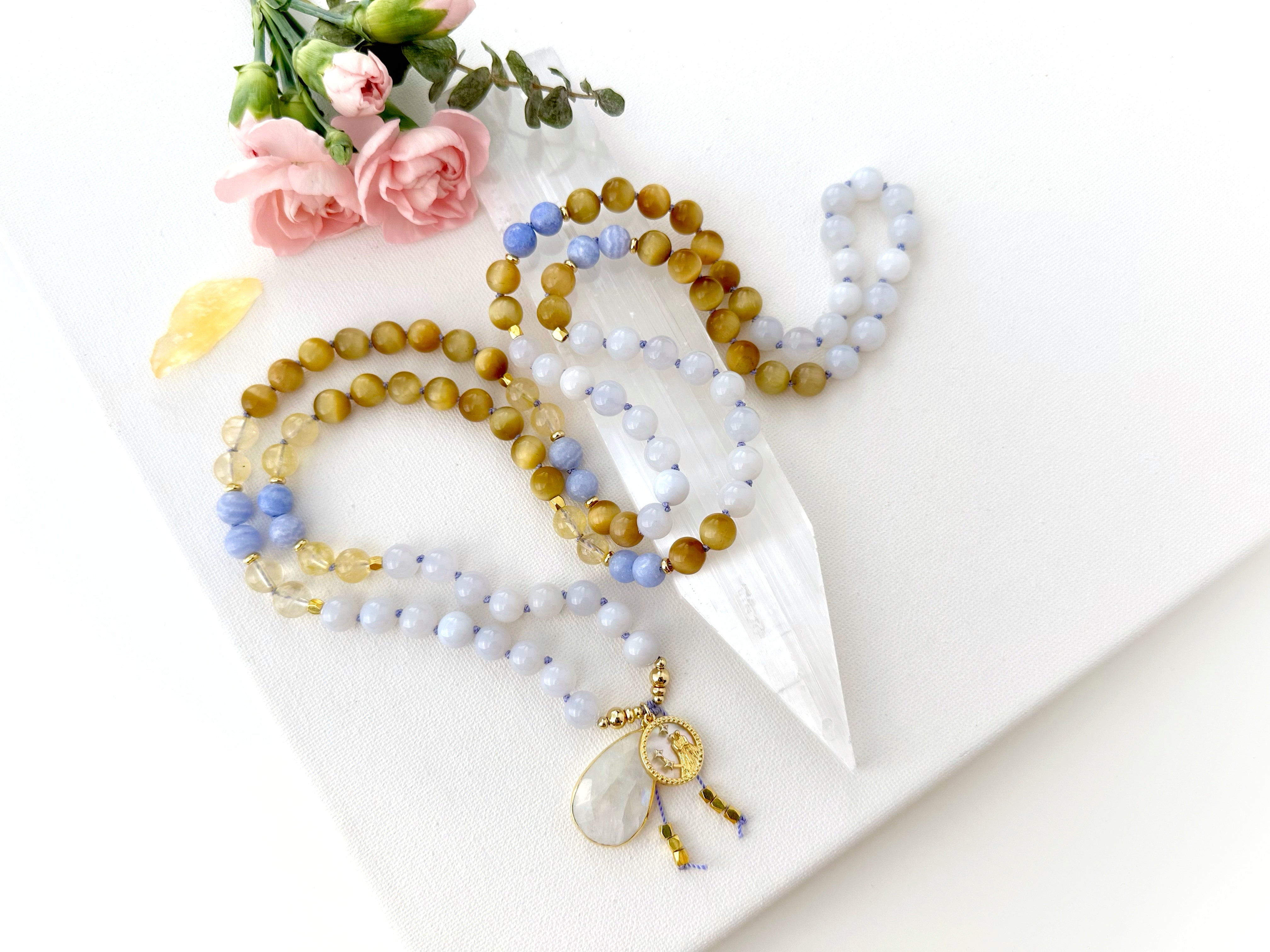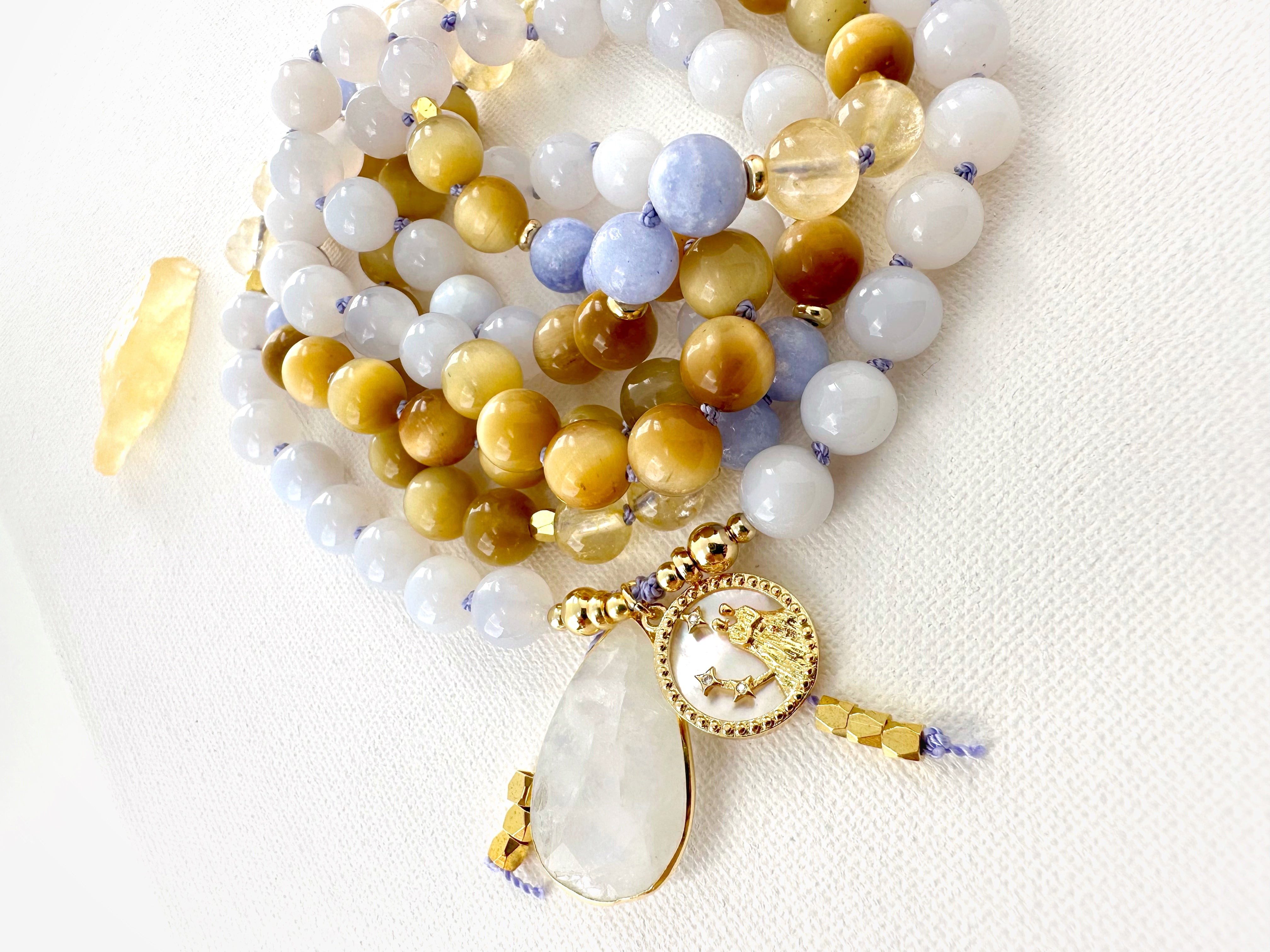 The Twin Winds Gemini Mala Necklace is hand-knotted with Citrine, Tiger's Eye, Blue Lace Agate, and Chalcedony beads, crafted to enhance Gemini's natural communication skills, adaptability, and mental clarity.