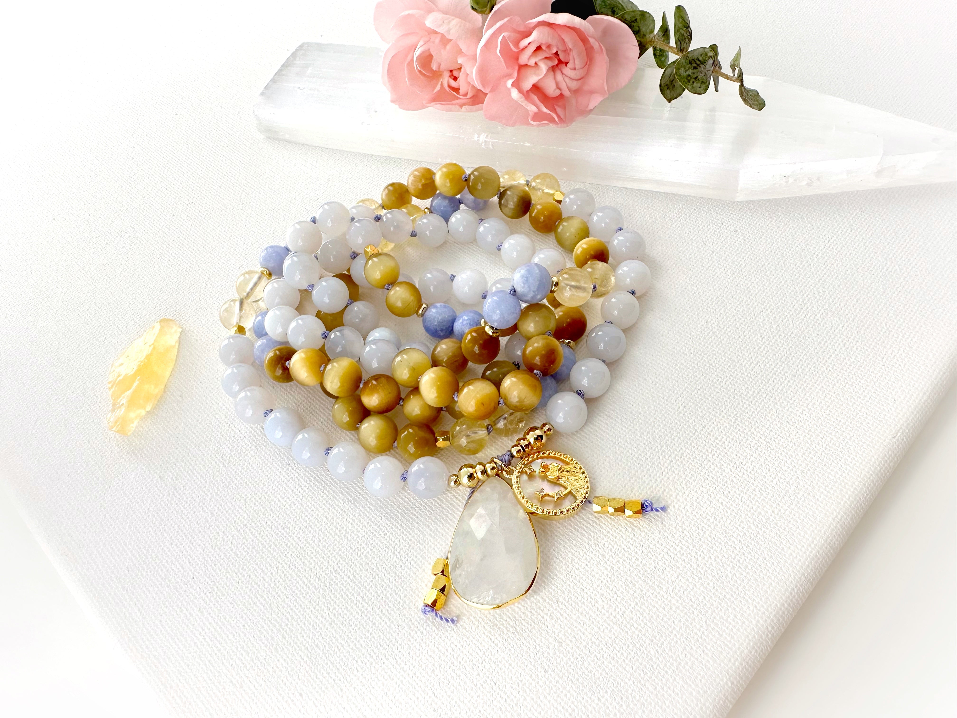 Gemini Mala Necklace - Tigers Eye Citrine Blue Lace Agate Meditation Beads