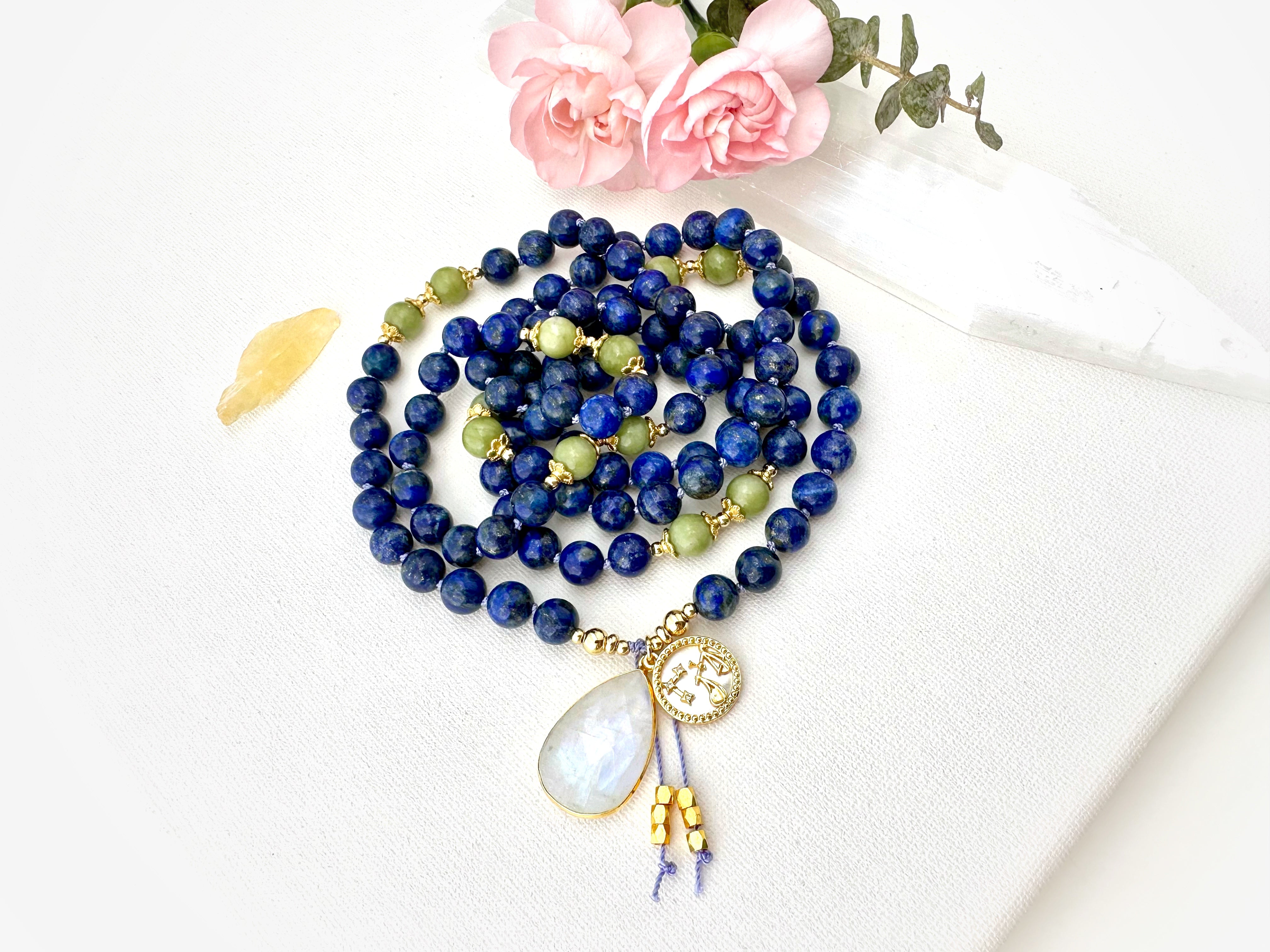 Libra Mala Necklace - Blue Lapis Lazuli Peridot Meditation Beads